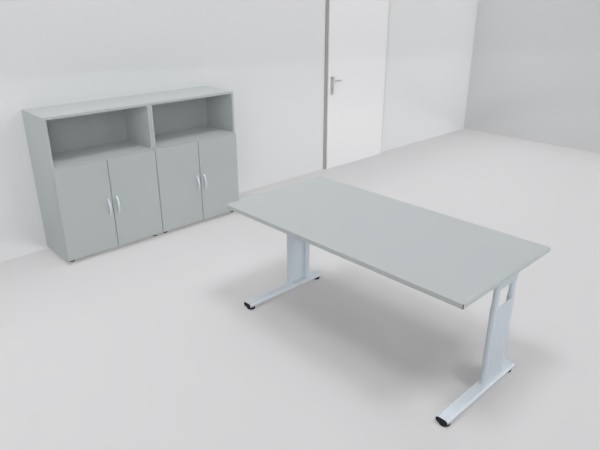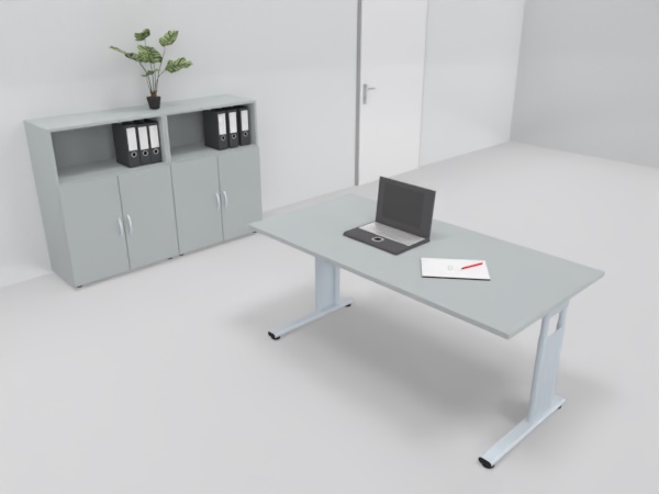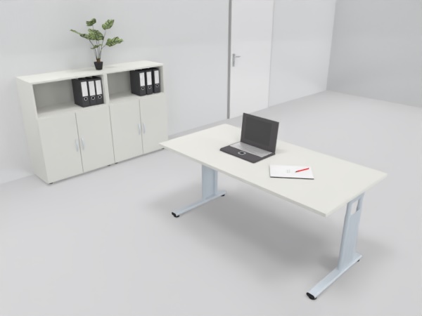 Tischplatte 25 mm Dreischicht-Feinspanplatte, Melaminharzbeschichtung, 3 mm ABS-Umleimer, Radius 3 mm gerundet.Traversengestell in C-Fuß-Ausführung mit gerader Kufe und Bodenausgleichsschrauben, jeweils ein verkürzter Fuß, Arbeitshöhe 68 bis 82 cm (verstellbar über eine Rohr-in-Rohr-Führung durch je zwei Inbusschrauben), silberfarben. Die Seitenteile beinhalten eine einteilige Blende.