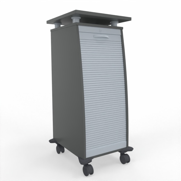 Der Bürocaddy mit Rollladen ist ausgestattet mit Schubkästen und 2 Fachböden. Ein Utensilienauszug bietet Platz für die sichere Ablage von Stiften und Kleinteilen.